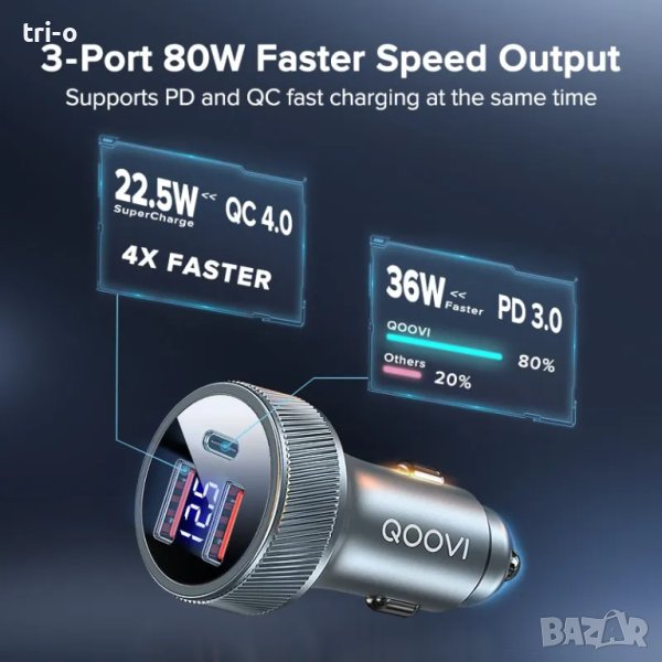 QOOVI 80W метално зарядно за автомобил 2хUSB+Type C / Бързо зареждане.