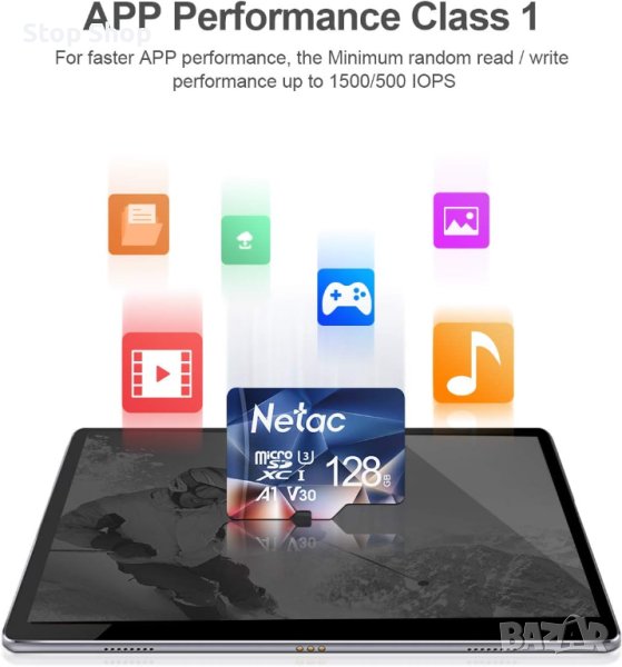 - Висока производителност: Зареждайте приложения по-бързо с A1 производителност (производителността на A1 е 1500 IOPS за четене, 500 IOPS за запис), идеално за съхраняване на документи, снимки и видеоклипове.