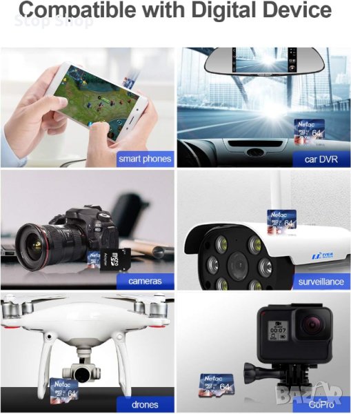 - Широко приложение: Micro SD картата е с висока съвместимост за различни видове устройства, включително смартфони, таблети, дронове, таблети с Android, таблетни компютри, екшън камери, Nintendo Switch, DSLR и Full HD видеокамера.