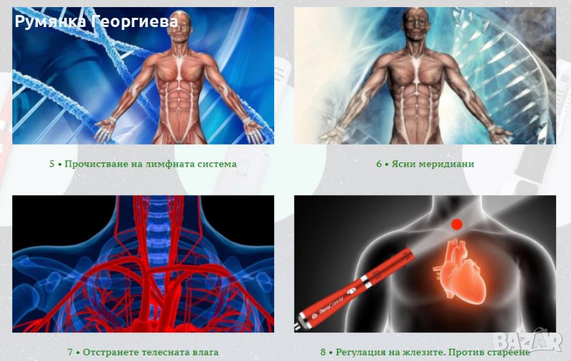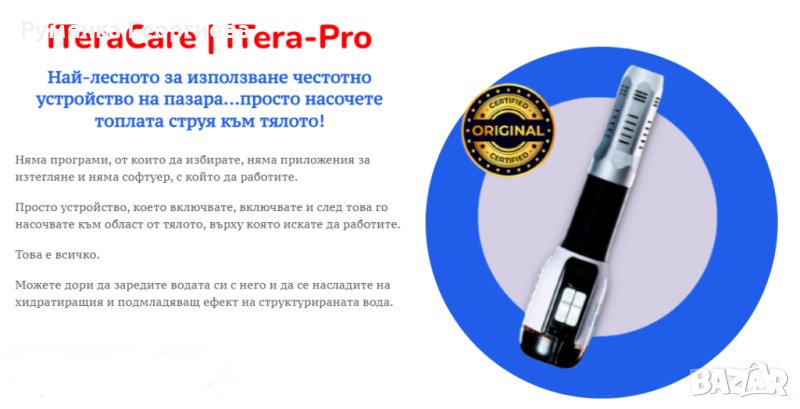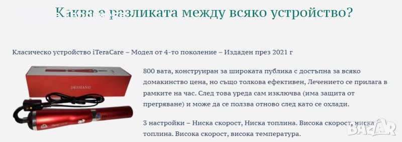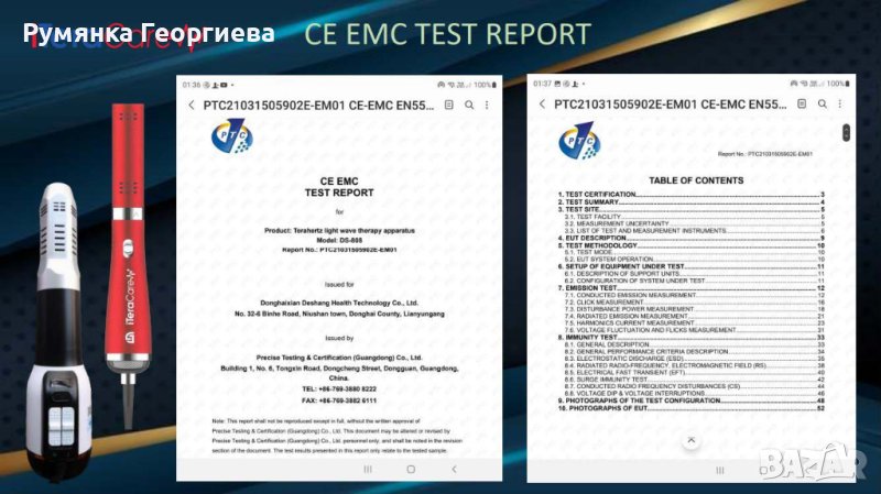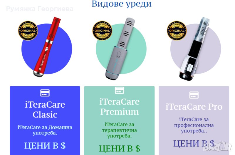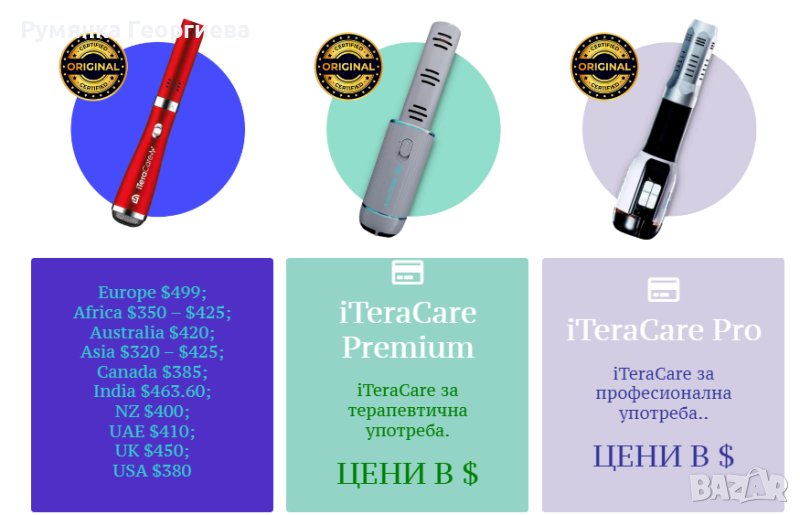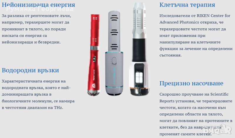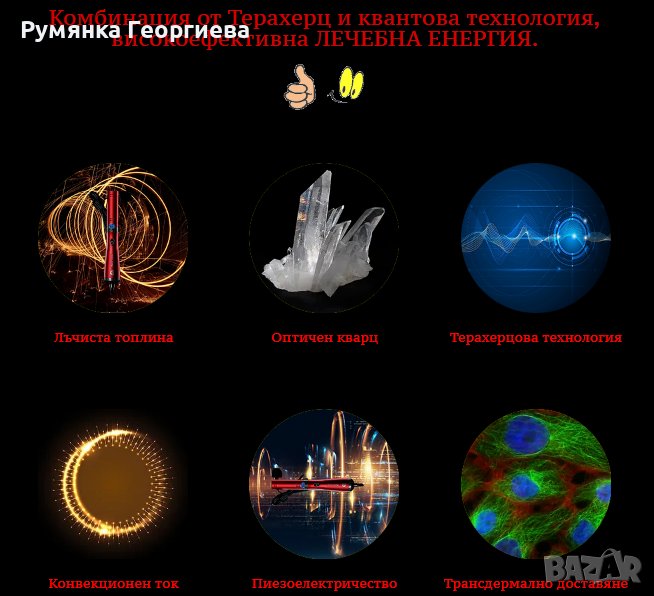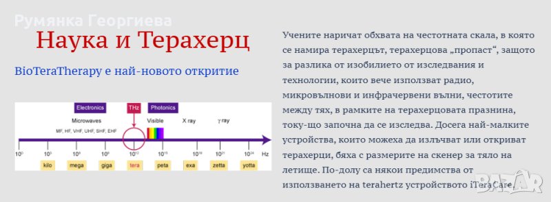 Устройството iTeraCare е сертифициран домакински електроуред. Има рейтинг „безопасен за употреба“. Не излъчва вредни лъчения и има етикети, които позволяват международното му разпространение. Накрайникът iTeraCare не е медицинско изделие и производителят не предоставя медицински съвети. Потребителите потвърждават, че устройството не е предназначено да се използва като медицинско устройство или за диагностични цели. Не е предназначен да се използва като заместител на медицинско лечение или съвет от квалифициран лекар. Потребителите потвърждават, че използват накрайника iTeraCare на свой собствен риск.За всякакви въпроси, свързани със здравословното състояние или оптималното използване на iTeraCare, може да се свържете с мун по мобилния телефон - 0899754486. Цената на устройството е 499 щатски долара и левовата стойност зависи от курса на долара на БНБ!Технологията Tera Hertz е най-новата терапия в света на модерното лечение. С помощта на терахерцови вълни, открити през 80-те години на миналия век, които съответстват на честотата на вибрациите на човешките клетки, терапията подпомага притока на кръв, като нормалните здрави клетки абсорбират терахерцовите вълни, а спящите клетки се активират отново. В резултат на това увредените клетки се възстановяват, което води до подобряване на времето за оздравяване в областите на травма и оставя у пациента усещане за енергия. Редовната употреба също така укрепва и индуцира органичните молекули на ДНК, като подобрява самовъзстановяването на телесните клетки.THz (терахерцовите) вълни са форма на нейонизиращо лъчение и съдържат ниска енергия на фотоните, като се абсорбират силно от полярни молекули като водата както в газообразно, така и в течно състояние. Той показва дълбочината на проникване на терахерцовите вълни в нашите биологични тъкани.Области на приложение на ТЕРАХЕРЦ ТЕХНОЛОГИЯ:- Спектроскопски анализ- Контрол на качеството- Фармацевтични приложения на терахерца- Медицински приложения на терагерцовата технология- Стоматологично приложение на терагерцова технология- Защитно филтриране и др.Терахерцовите вълни вибрират със същата честота като нормалните телесни клетки. Когато терахерцовите вълни проникнат в тъканите на тялото, те преминават през здравите клетки при постоянна температура, но карат нездравите клетки да вибрират по-бързо, което необичайно повишава температурата на клетките, причинявайки нездравословните клетки да умрат в процеса. Заедно с квантовата технология терахерцовите вълни проникват по-дълбоко и по-бързо.ТерахецТерахерците резонират със същата честота като нормалните човешки клетки, генерирайки милиони вибрации в секунда, като по този начин активират здрави и спящи клетки, като същевременно елиминират нездравословните клетки и свободните радикали.Скаларна енергияГенерира скаларни енергийни вълни, които енергизират нашите клетки, балансират телесните системи, укрепват тялото, произвеждат лечебна енергия и проникват по-дълбоко в жизненоважните органи.Оптичен кварцОптичният кварц усилва енергията, генерирана от устройството, създавайки по-мощен резултат. Имитира 1/40 от UV енергията на слънчевата светлина. Укрепва ауричните полета в тялото.Комбинация от Терахерц и квантова технология за високоефективна ЛЕЧЕБНА ЕНЕРГИЯ!Лъчиста топлинаТокът преминава през навит Nichr