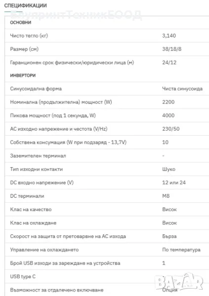 *Пикова мощност: 4000W - налична е за част от секундата! Тя е необходима за стартиране ня някои консуматори при които необходимата мощност за „развъртане“ на електромотора е в пъти по-голяма от нужната след това. За пример хладилник за домашна употреба в повечето случаи изисква стартова (пикова) мощност от около 900 вата а секунда след това продължава да консумира едва 50-90 вата. Такива електроуреди са компресорните хладилници, класическите фризери и климатици които нямат плавен старт, винтовите подемни крикове и т.н.