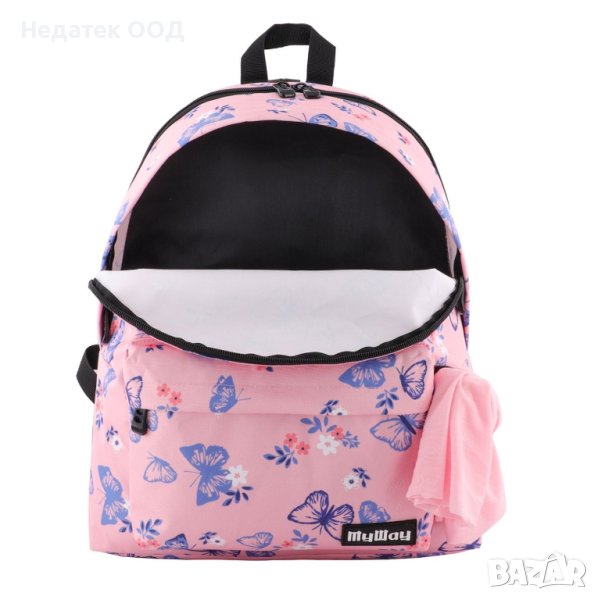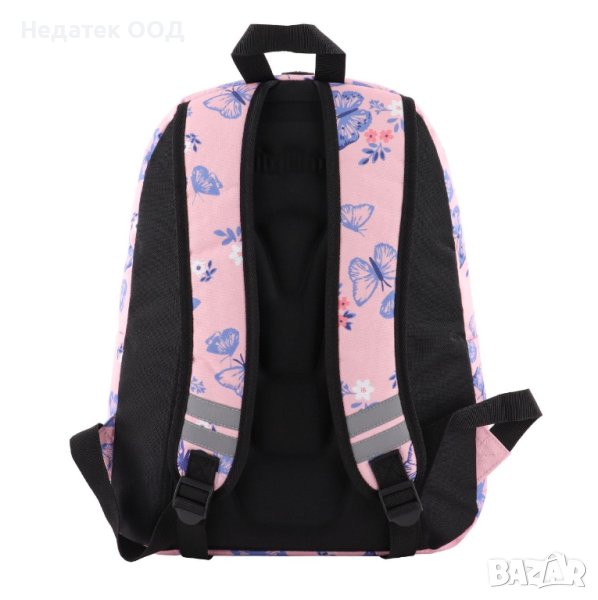 Ученическа раница, в розов цвят със сини пеперуди. Има 2 големи джоба, външен джоб, страничен вътрешен джоб за мобилен телефон, изход за кабел за слушалки и вътрешен джоб с цип. Има подсилен EVA гръб, регулируеми презрамки със светлоотразителни ленти, метални ципове и дръжка. Ще имате и бандана за врата или главата в розово.