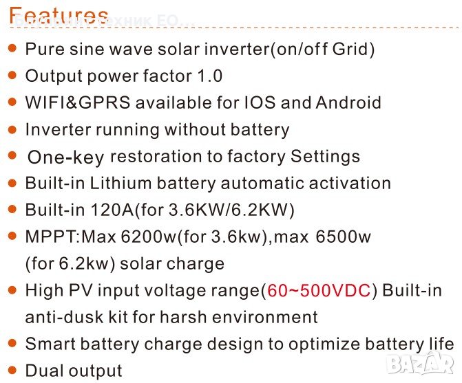 Максимално входящо напрежение от соларните панели: 500VOC DC