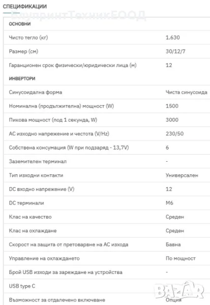 *Пикова мощност: 3000W - налична е за част от секундата! Тя е необходима за стартиране ня някои консуматори при които необходимата мощност за „развъртане“ на електромотора е в пъти по-голяма от нужната след това. За пример хладилник за домашна употреба в повечето случаи изисква стартова (пикова) мощност от около 900 вата а секунда след това продължава да консумира едва 50-90 вата. Такива електроуреди са компресорните хладилници, класическите фризери и климатици които нямат плавен старт, винтовите подемни крикове и т.н.