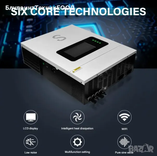 Соларният контролер с MPPT технология гарантира максимален добив и ефективно оползотворяване на фотоволтаичната енергия. Инверторът поддържа входящ ток до 18А на всеки контролер и напрежение до 500 V DC, което позволява свързване на повече панели в серия и минимизира загубите при преноса на енергия. Максималната мощност на свързаните панели е 2х 5500W. Дисплеят на инвертора показва количеството усвоена соларна енергия в kW/h.
