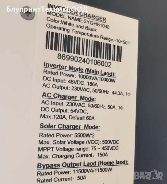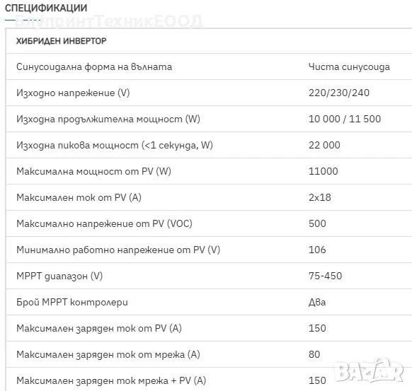 Соларен инвертор 10kw Хибрид / 11.5kw мрежови, 48V, 2Х MPPТ, монофазен