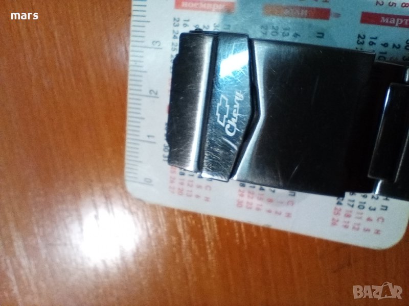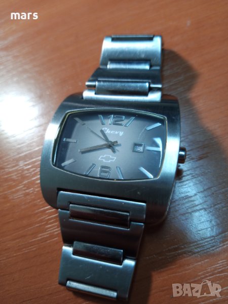 Мъжки часовник,рекламен продукт на "chevrolet", кварцова машина на MIYOTA CITIZEN с дата, 5 ATM. водоустойчивост, стоманена каса с размери-47/42мм., брандирана стоманена верига. Отличителен преливащ сив циферблат с ретро излъчване. Работи точно, много запазен. Рядък и красив аксесоар.