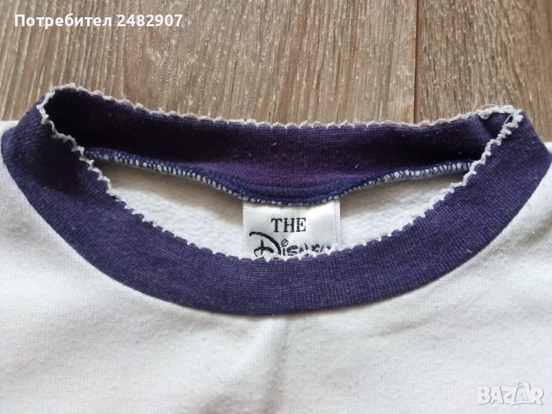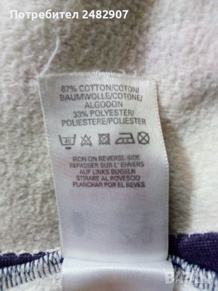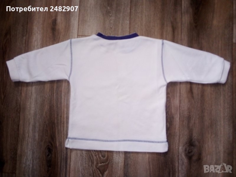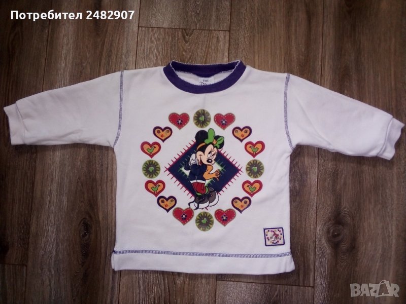 Бяла детска блузка за момиче с цветна щампа отпред. Съдържа 67 % памук и 33 % полиестер. Ширина в раменете - 34,5 см, ширина под мишниците - 37, 5 см, дължина от рамото до долу - 42 см, дължина на ръкава от рамото - 26 см. Много запазена, с нормални следи от износване.