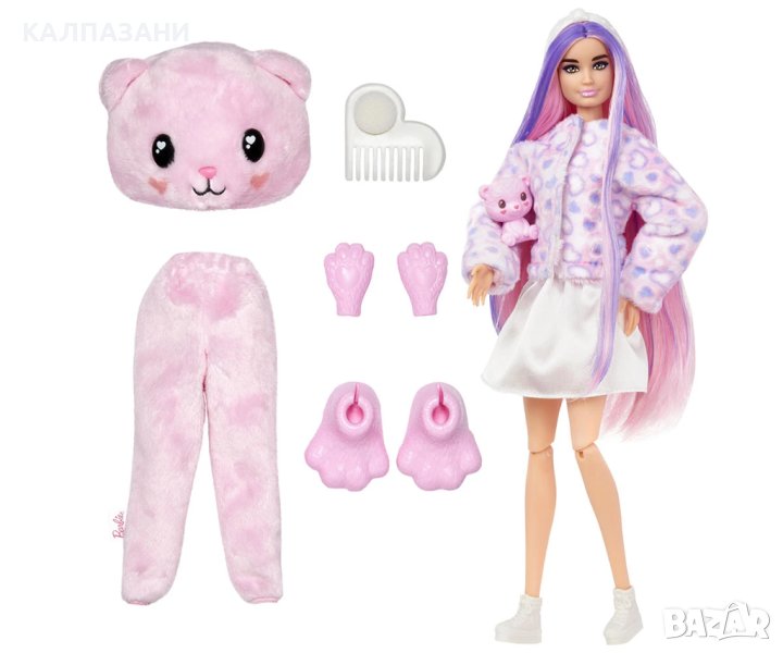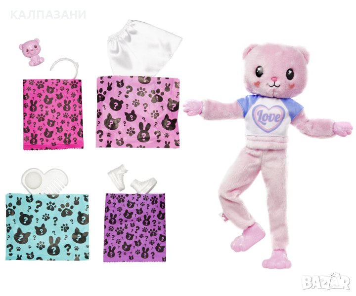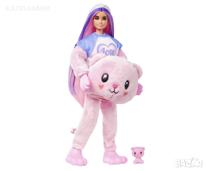 Куклите Barbie® Cutie Reveal™ Cosy Cute Tees™ предлагат най-сладкото изживяване при разопаковане с 10 изненади! Открийте пухкаво, розово плюшено мече, облечено в шита тениска с надпис „Любов“. Премахнете плюшения костюм, за да разкриете удобна кукла Barbie® с дълга цветна коса. Станете по-уютни с още изненади за отваряне като лента за глава, сатенена пола и подходящ мини домашен любимец. Обърнете плюшената горна част за поларено яке и обърнете главата на костюма за легло за домашен любимец. Ледено студената вода добавя още повече привлекателност с промени в цвета на косата на куклата и мини домашния любимец – топлата вода ги променя за повторно забавление! Децата ще обичат да откриват всички сладки изненади в тази уютна сладка серия Barbie® Cutie Reveal™. Включва кукла в костюм на животно и 10 изненади. Всяка кукла се продава отделно в зависимост от наличността. Куклата не може да стои сама. Цветовете и декорациите могат да варират.