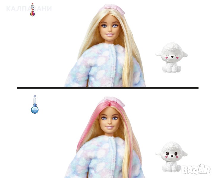 С 10 изненади в 1 опаковка, куклите от серията Barbie® Cutie Reveal™ Cosy Cute Tees™ доставят най-сладкото изживяване при разопаковане с плюшени приятели животни, мода и трансформиращо забавление! Коя кукла ще разкриете? Разопаковайте, за да намерите сладко плюшено агне, облечено в цветна тениска с вдъхновяващо послание „Мечта“ и криещо кукла Barbie® вътре! Повдигнете главата на костюма и разкрийте красивата кукла Barbie® с дълга руса коса с розови ивици, 9 подвижни стави и блестящи детайли на лицето! Отворете 4-те пликчета с изненади, за да намерите модни дрехи и аксесоари - като сатенена пола, лента за глава Barbie®, чифт обувки, гъба-гребен и очарователно подходящо мини агне! Децата могат да обличат и оформят куклата Cutie Barbie®, като обърнат горната част на костюма, за да намерят супер меко поларено яке с щампа на облак в цвят бонбон. Главата на костюма се превръща и в легло за малкия домашен любимец! Използвайте ледено студена вода, за да преобразите косата на куклата Barbie® с цветна ивица и да „отворите“ и „затворите“ очите на мини домашния любимец – сменете отново с топла вода. Повторете отново и отново! Серията кукли Barbie® Cutie Reveal™ Cosy Cute Tees™ е страхотен подарък за деца от 3 до 7 години, особено за тези, които обичат да откриват сладки изненади!
