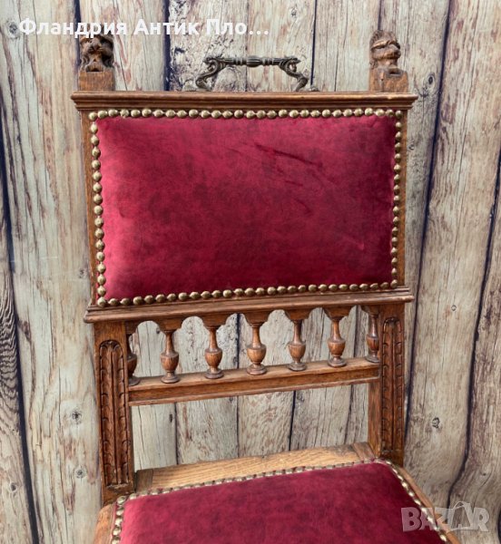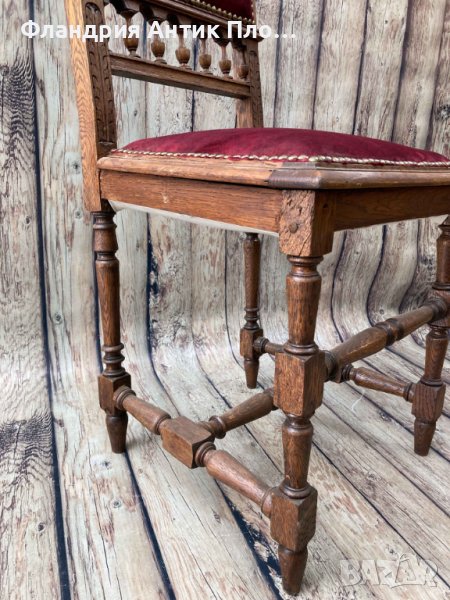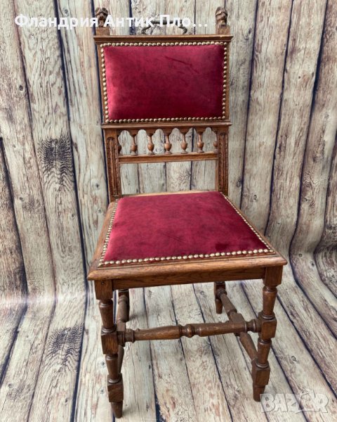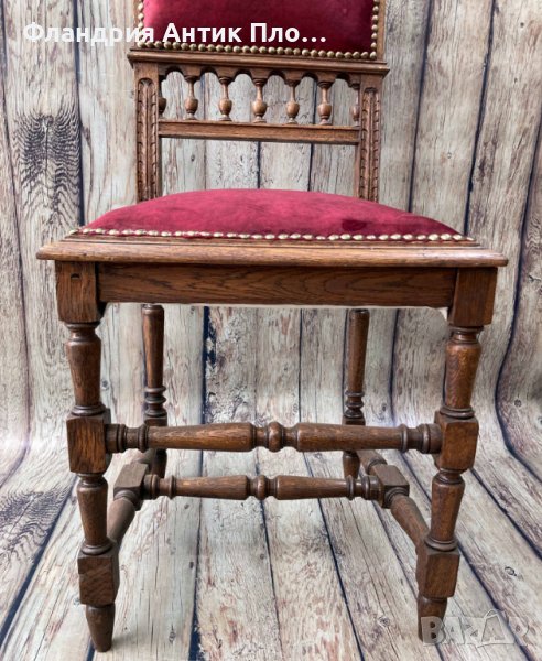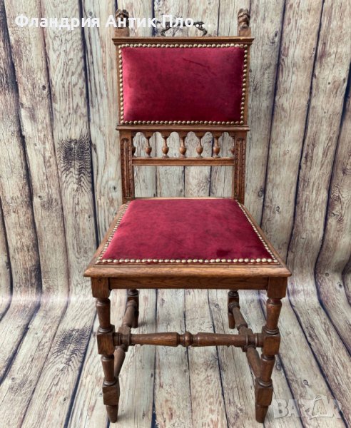 Червената текстилна дамаска, с която са облечени столовете, добавя нотка на топлина и стил. Изработена с внимание към качеството и детайла, тя придава уют и комфорт на сядането, като същевременно хармонизира перфектно с дърворезбите и общата естетика на столовете.