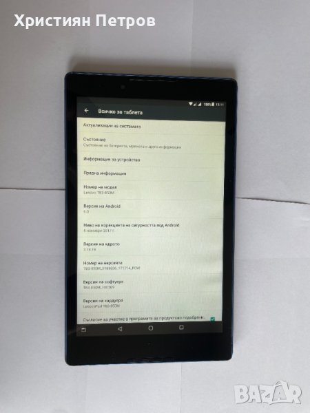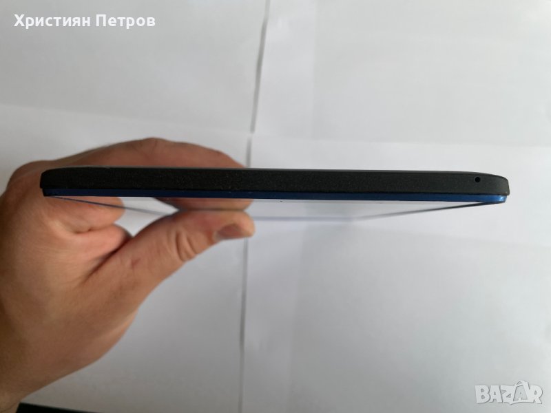 Продавам Lenovo Tab 3 8 инчов таблет с модел TB3-850M с 16GB вградена памет, черен с сини лайсни на цвят. Таблета е фабрично отключен и за двете SIM карти, което означава, че може да работи с всички мобилни оператори. Инсталирана е последна версия Android софтуер за модела - Android 6.0 (Marshmallow). Всички функции работят перфектно. Таблета има леки ожулвания на самите сини лайсни, което може да се види на снимките, но като цяло е доста запазен. Предното стъкло е без забележки, понеже винаги е носен с протектор. Закупен е от Технополис и няма остатъчна гаранция. Продава се пълен комплект с кабел, зарядно, слушалки и бонус - microSD карта с памет 32GB.