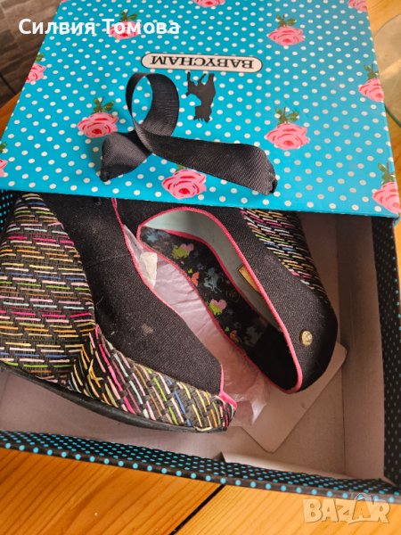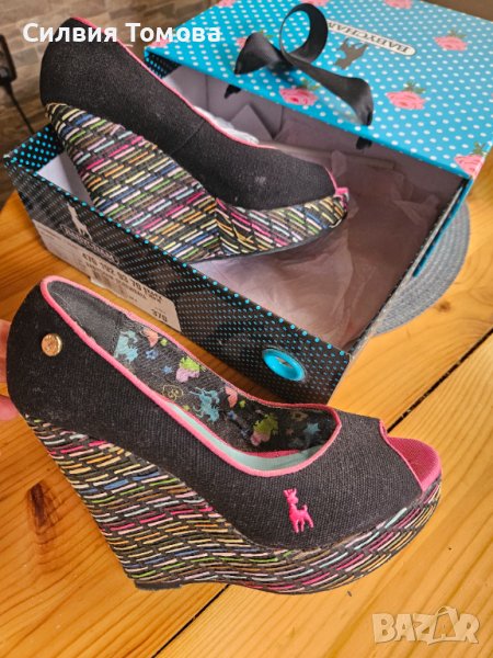 Уникални обувки с висока платформа с отворени пръсти Babycham. Много стилни ,елегантни.Емблемата сърненце е бродерия.Викок клас.Високо качество.Обувани 2 пъти за повод.Размер UK 4. -36ти.
