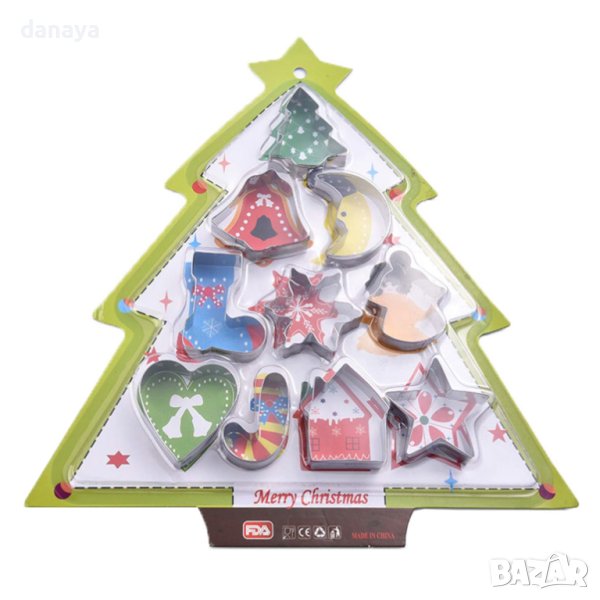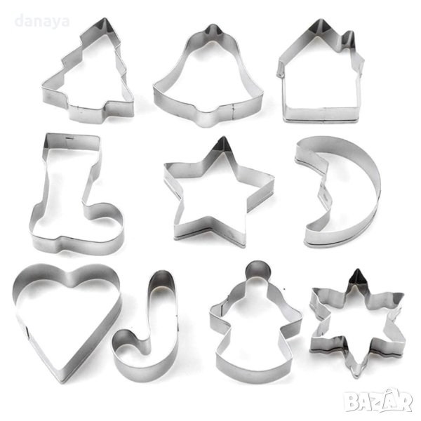 Комплект от 10 броя метални резци за коледни сладки. Комплектът включва резец коледна елхичка, резец коледнакамбанка, луна, коледен ботуш, коледна звезда, ангел, сърце, захарно бастунче, къщичка, коледна звезда. Изработени от неръждаема стомана. Формичките са идеални за изрязване и приготвяне на коледни дребни сладки, бисквитки, чудесни са за работа със захарно тесто, фондан, за изрязване и декориране на салати и ястия и други.