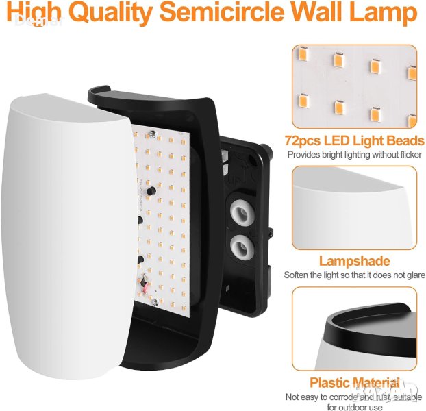Представяме ви нашата полипропиленова пластмасова външна LED стенна лампа: Издръжлива и устойчива на ръжда, с IP65 водоустойчив рейтинг. 72 броя LED мъниста предлагат равномерно топло бяло осветление. Модерният дизайн подобрява вашето пространство. Лесен монтаж в 3 стъпки. Подходящ за вътрешна и външна употреба.