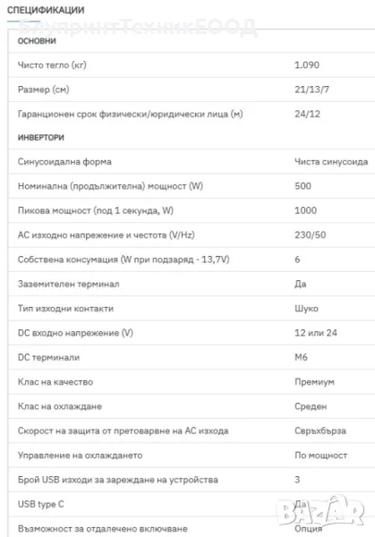 *Пикова мощност: 1000W - налична е за част от секундата! Тя е необходима за стартиране ня някои консуматори при които необходимата мощност за „развъртане“ на електромотора е в пъти по-голяма от нужната след това. За пример хладилник за домашна употреба в повечето случаи изисква стартова (пикова) мощност от около 900 вата а секунда след това продължава да консумира едва 50-90 вата. Такива електроуреди са компресорните хладилници, класическите фризери и климатици които нямат плавен старт, винтовите подемни крикове и т.н.