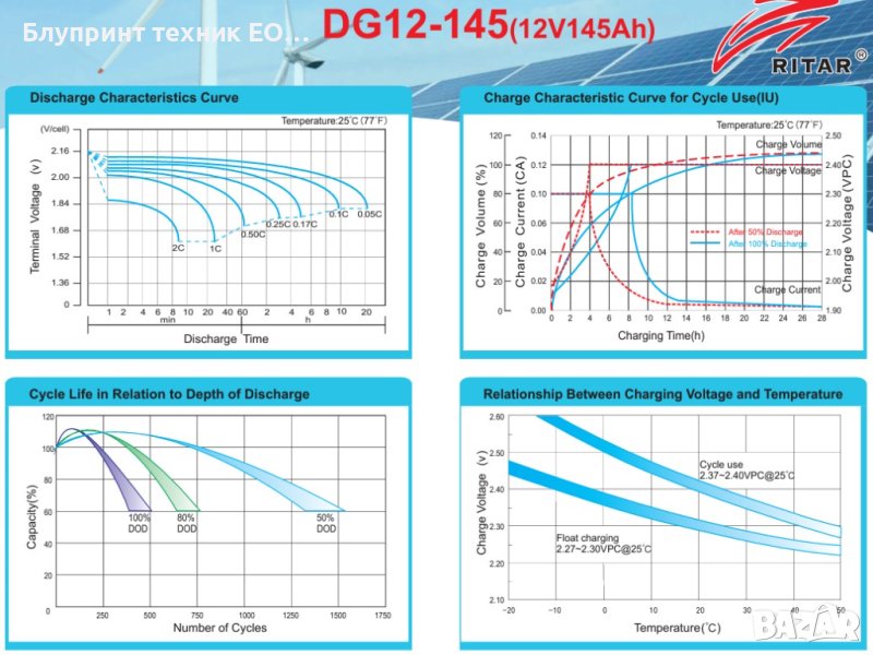 Серията DG на RITAR са проектирани основно за UPS системи, съответно за дълбоки разряди. Използвайки специално проектиран активен материал и здрави решетки, клапан-регулираната GEL оловно-киселинна батерия, предлага надеждна работа при приложения с продължително натоварване и може да осигури до 1500 цикъла при 50% разряд (50% DOD). Подходящ за задвижване на малки превозни средства с електродвигатели, соларни и вятърни системи, кемпери и каравани, лодки, почистващи машини, голф колички, електрокари, помощни превозни средства, UPS и др. Необслужваеми, рентабилни и много надеждни при правилна експлоатация! Абсолютно неподходящи са за стартиране на двигатели с вътрешно горене! Серията DG на RITAR е отлична като качество, а цената съпоставена с броя цикли е изключително конкурентна. Имайтев в предвид, че повечето батерии от бюджетен клас със сходна цена на пазара, рядко могат да бъдат циклирани повече от 200-300 пъти!