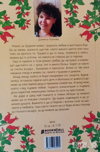 „За глътка въздух“ от Даниела Паскова е роман за трудния живот, трудната любов и жестоката борба за онова малкото щастие, което винаги шепти или чука тихо на вратата ти. Трудно е да го чуеш, понякога е невъзможно да го усетиш, но никога не спираш да го търсиш. Щастието е като футболна топка. Гониш я, докато бяга пред теб, а спре ли на едно място, я риташ силно и всичко започва отначало. Дали героите в този роман сами подритват малкото си щастие или точно когато протегнат ръце, за да го хванат, жестоката съдба бърза да го изрита силно в друга посока?