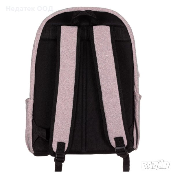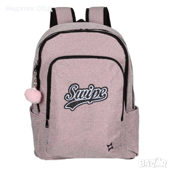 Ученическа чанта от розов плат с блясък и Swipe бродерия. Има 2 големи джоба, джоб за лаптоп, малък преден джоб и странични джобове. Има подсилени гръб и долнище, регулируеми презрамки и дръжка. Има ключодържател с черен помпон на ципа.