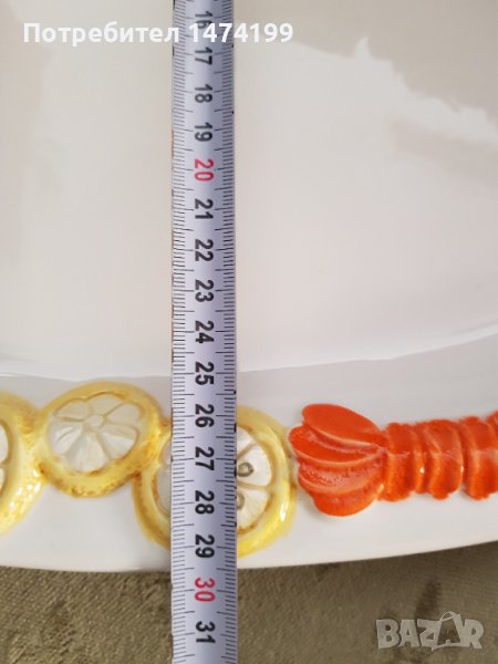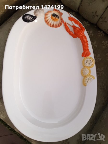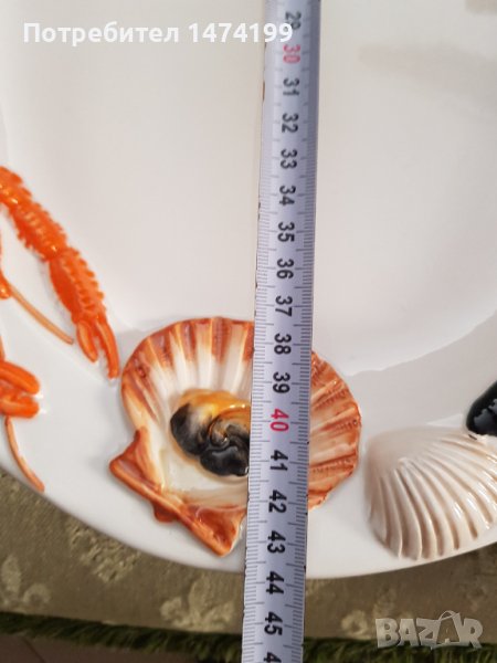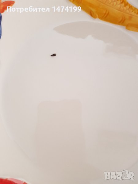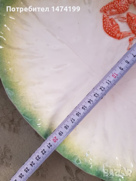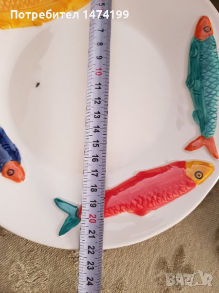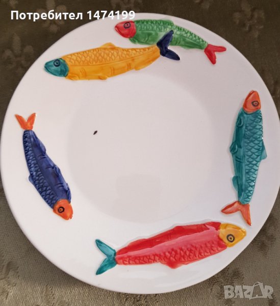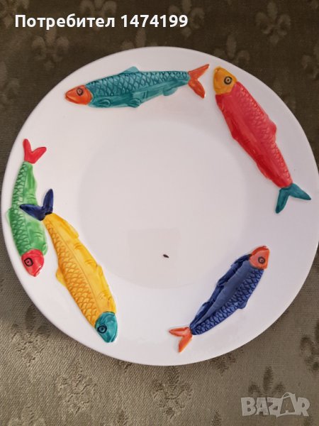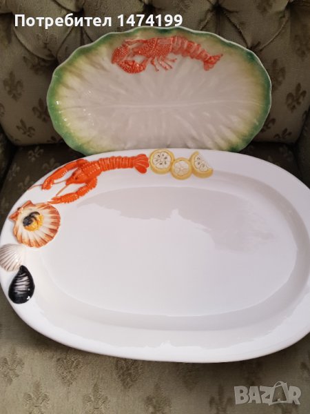 За вашите морски вечери - 2 плата и 1 чиния от италианска арт керамика. Без забележки - само чинията с рибките има фабричен дефект - черна точка (вижте снимките)-продадена!! Размерите са показани. Най-голямото плато е с цена 95.00лв; това в зелено -65.00лв - ПРОДАДЕНО! и чинийката е 14.00лв.-продадена