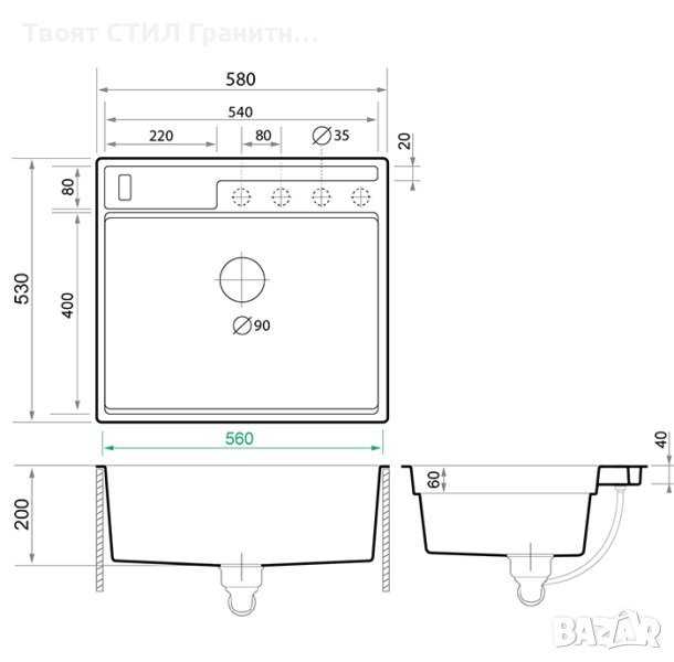 Продуктовите снимки показват предложената инсталация със сифони Твоят Стил. Преливникът и цедката, които се виждат на графиката, не са елементи от мивката и се продават отделно. За правилното монтиране на мивката е необходим персонализиран сифон с вертикален преливник.