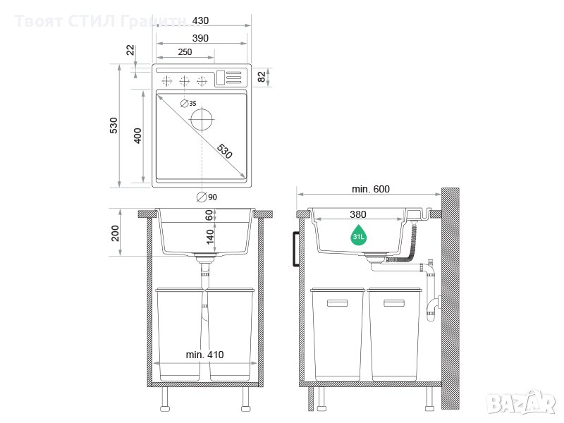 Продуктовите снимки показват предложената инсталация със сифони Твоят Стил. Преливникът и цедката, които се виждат на графиката, не са елементи от мивката и се продават отделно. За правилното монтиране на мивката е необходим персонализиран сифон с вертикален преливник.
