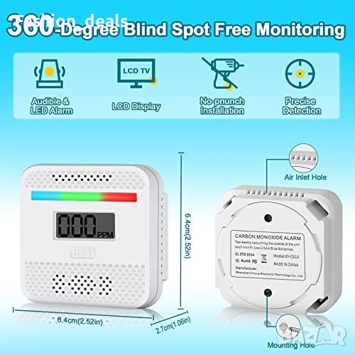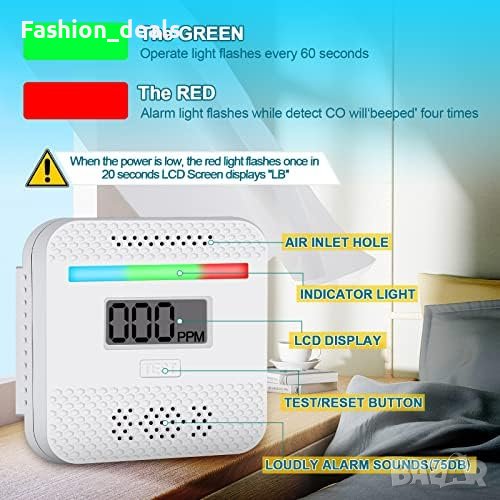Безжичен детектор за въглероден оксид Дигитален дисплей за лесно разчитане Предупреждение за ниско ниво на батерията Захранване с батерии, лесно заменяеми Електрохимичен сензор за прецизно измерване Силен звуков сигнал за алармиране