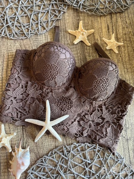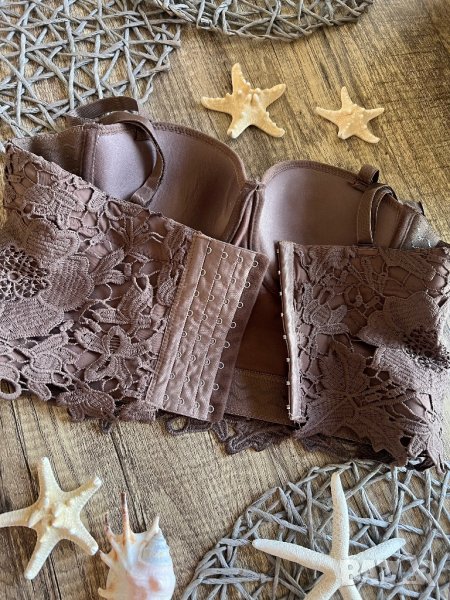 Чисто ново бюстие в мек кафяв цвят. Стои много красиво. За жена със средноголям бюст е.