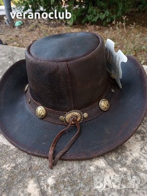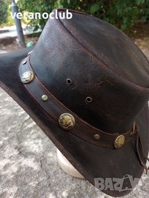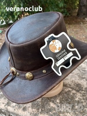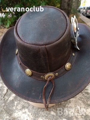 Автентична Австралийска шапка от естествена кожа - buffalo leather, кожа от биволска крава, която се характеризира с изключителна здравина и комфорт. Провокативно предложение от необятната австралийска шир. Цвят на шапката - тъмнокафяв.