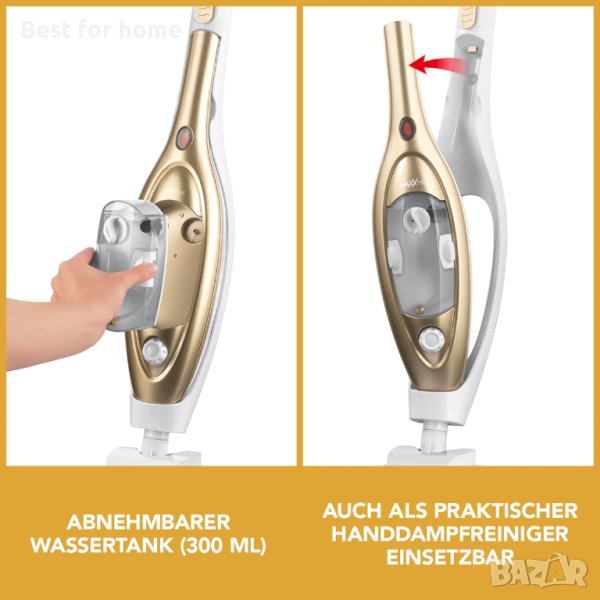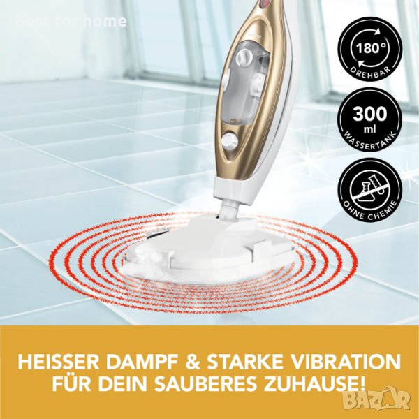 За кратко време можете да използвате вибриращата парна метла, за да почистите подовете си с пара при 100 °C - по този начин можете да елиминирате до 99% от бактериите без никакви химикали. Гъвкавият универсален уред е подходящ и като ръчна парочистачка или за почистване на килими или прозорци.