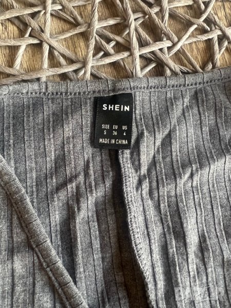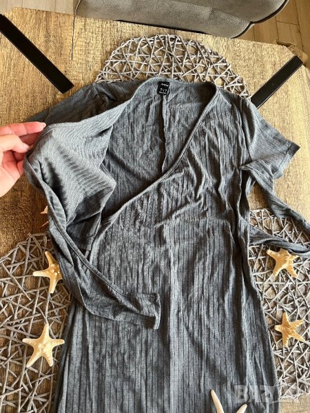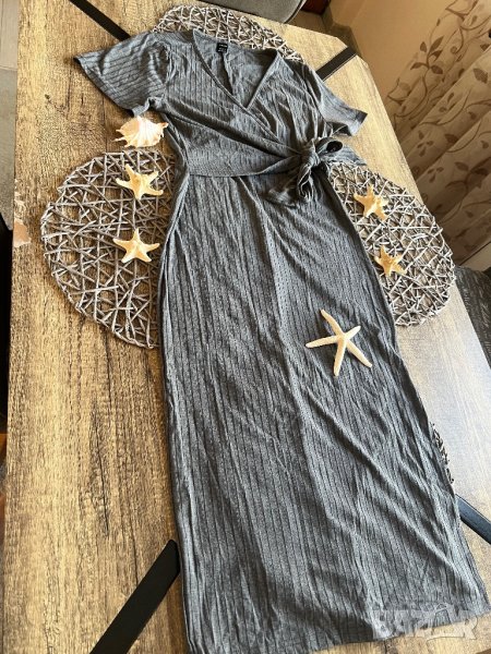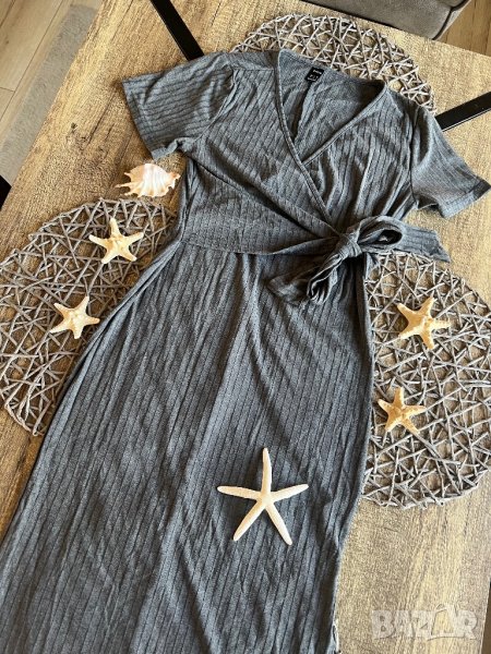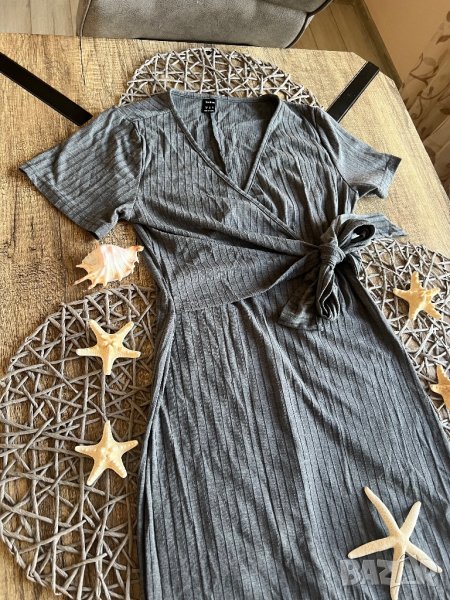 Роклята е графитено сива, рипсена. Силно еластична, с прехлупване. Очертава тялото. Обличана веднъж, без забележки.
