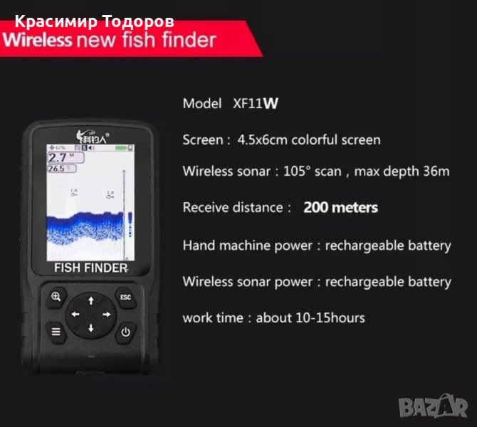 Меню на Руски и Английски.Безжичен сонар за риболов с цветен дисплеи и обхват до 200 м.