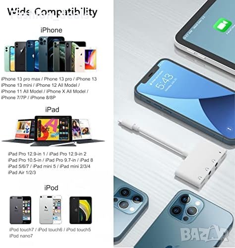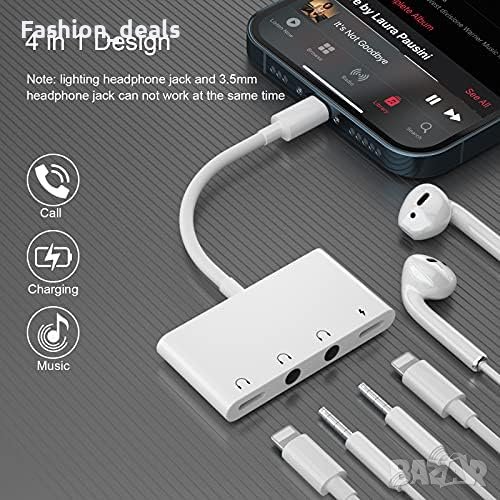 - 4 в 1 сплитер за iPhone: 1 заряден порт, 1 Lightning порт за слушалки и 2 x 3.5 мм жак порта