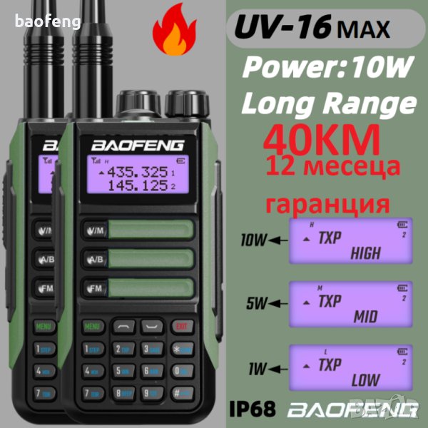 Радиостанцията Baofeng UV-16 ULTRA е водоустойчива със сертификат IP68 ( модела 9r PLUS e с IP67) Много е популярна, особено сред радиолюбителите, играчите на еърсофт, планински водачи, спасители и тн. Предавателят има голяма предавателна мощност от 25 W, LCD дисплей с подсветка в три цвята, 128 предварително зададени канала, възможност за задаване и запазване на имена на канали, обхват до 55 км и дълъг живот на батерията 12500 mAh до 40 часа работа. Можете да свържете слушалки към Baofeng UV-16 Ultra,той има индикатор за изтощена батерия, FM радио (85,0 MHz-108,0 MHz), фенерче и SOS аларма.