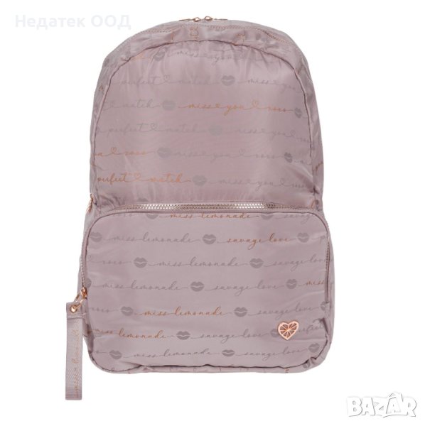 Ученическа раница в цвят , с бронзови букви от серията Miss Lemonade. Разполага с 1 голямо отделение с място за лаптоп, 1 по-малко отделение отпред, 1 голям джоб, цип с метални сърца и 2 странични джоба. Има анатомичен гръб и меки презрамки. Идеален за ученици от началното училище и тийнейджъри.