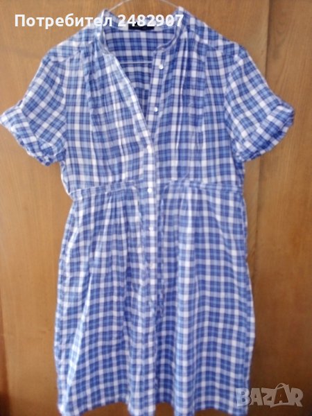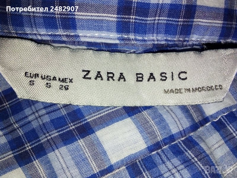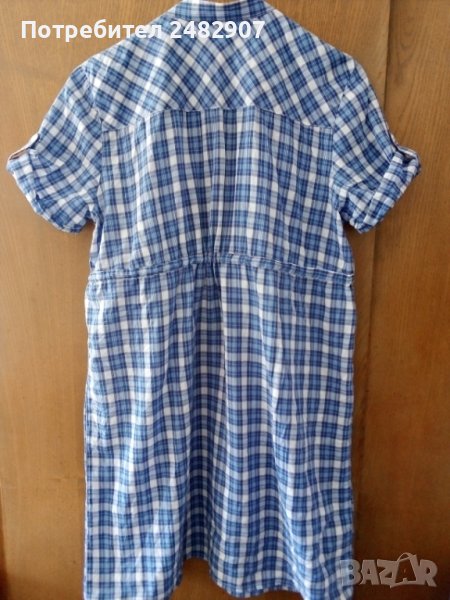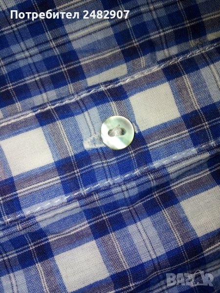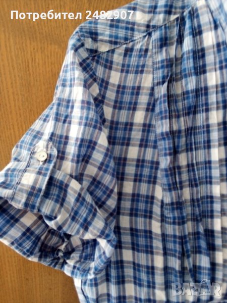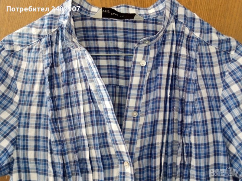 Дамска риза/туника в синьо и бяло, размер S. Ширина в раменете - 39 см, ширина под мишниците - 48 см, ширина в долната част - 57 см, дължина от рамото до долу - 85 см, дължина на ръкава от рамото - 26 см. Много запазена, много тънка, с връзки и закопчаване с 9 броя малки седефени копчета.