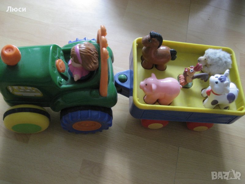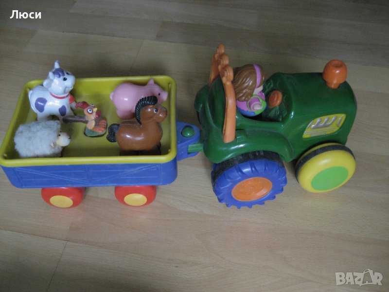 Само лично предаване...На 1-3 сн. донесен от Германия , ползван без забележки механичен Трактор - влак (с размер 40см) , Работи с 4 батерии 1,5 v - върви като натиснеш тръба отпред , пъшка като истински трактор . Като натиснеш кормилото свири клаксон . Като натиснеш водител , свири готината песен"Old MacDonald Had A Farm" . Животните в прицеп , при натискане блеят, кукуригат, издават звуци..= цена 15 ев . Три лота книги за бебета ползвани , чисти без надраскано и лекета , има леки следи от употреба . Музикални работят , нямат батерии . На 4-9 сн бебешки книги с дебели страници - 13 книги на български + 6 книги на русском = цена 10 ев .