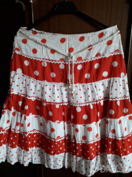 Дамска бутикова блуза червена с копринени къдрички на точки марка Viola. Блузата е много запазена, еластична материя. В обявите ми има същите цветове пола, която отделно се продава за 18 лв./виж на снимката/ и може да се комплектова с блузата. Размер М-Л, бюст 42-46 разтяга се /или обиколка 84-92 см/, дължина 58 см. Отговарям на съобщения тук, изпращам с куриер с отстъпка, преглед и тест, или лично предаване в София.