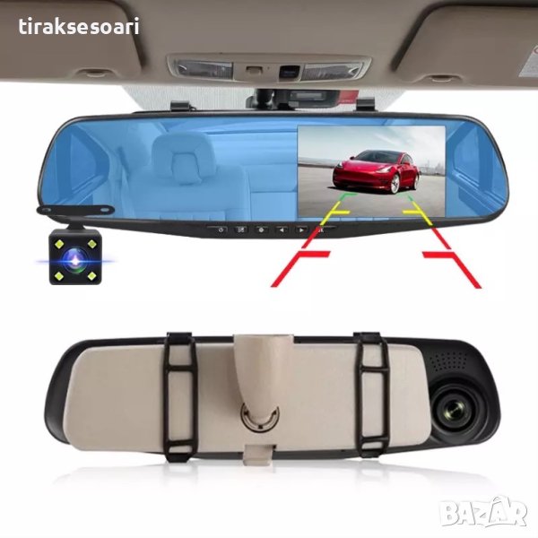 Авторегистратор видеорегистратор за автомобил с две камери предна и задна + огледало с монитор Full HD 1080P и 32 GB Micro SD Card карта с памет 12V - 24V