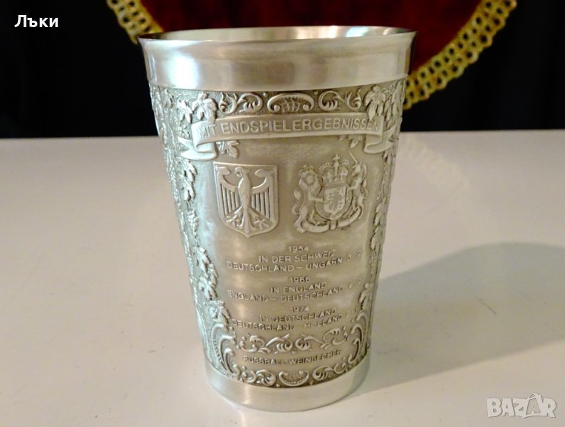 калай и 5% сребро,маркирана.Декорирана с релефни гербове и години на футболни първенства,лози,грозде и барокови орнаменти.Височина 8.5 см., диаметър 6 см.,