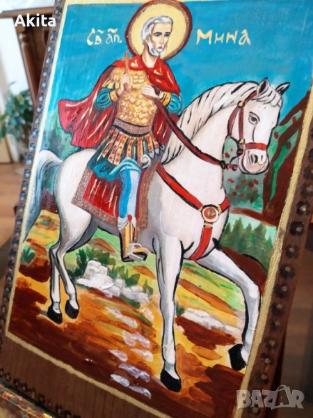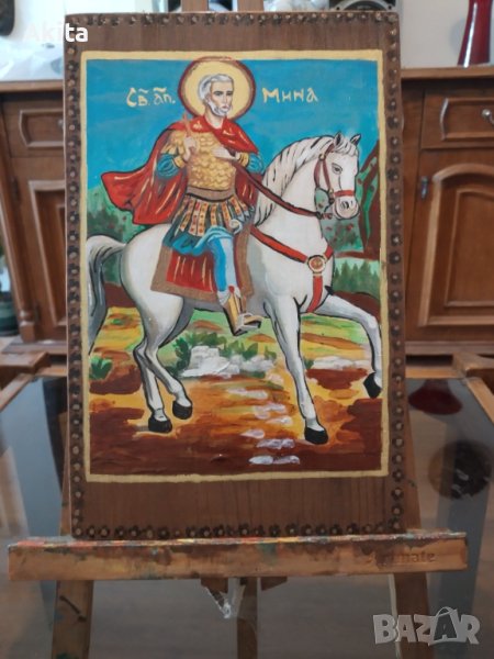 Икона на свети Мина,ръчна изработка върху естествено изсушено дърво и защитена с три слоя краен, предпазен лак.Смесена техника.Размери 16х26см.