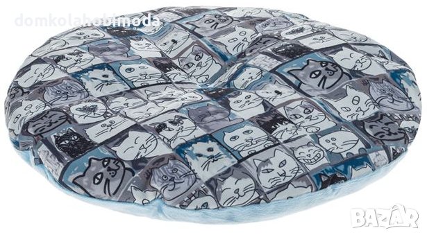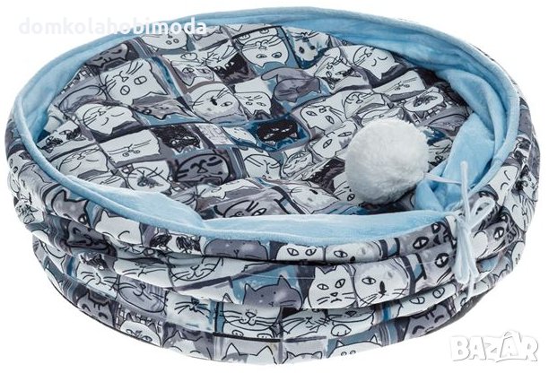 Кръгло котешко легло с рамка от стоманена тел и плат в сиво и синьо с десен на фигури на котки. Има мека възглавница за лягане, а горната част се затваря, за да създаде топло гнездо. Има висяща бяла топка за игра. Котките обичат да спят и това легло ще се превърне в любимото им място! Материал на продукта Полиестер Диаметър x Височина 40х40см,