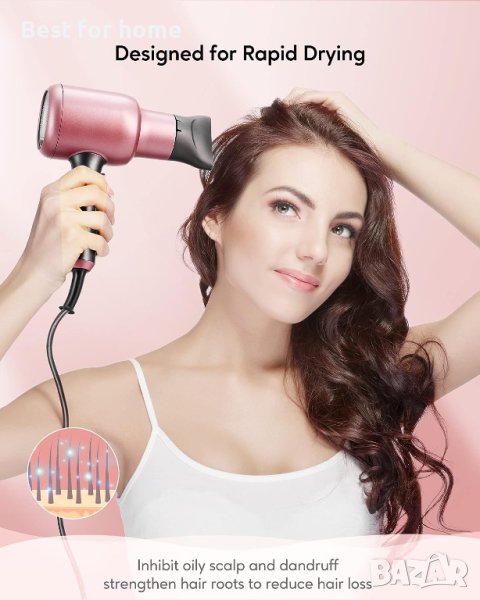 Двойна защита - термостат и предпазител Малкият сешоар за жени е настроен така, че да се изключва автоматично, когато температурата е твърде висока, ако сешоарът е покрит с кърпа или хартия по време на работа. Тази функция ви дава допълнителна безопасност, ако забравите да изключите йонния сешоар.