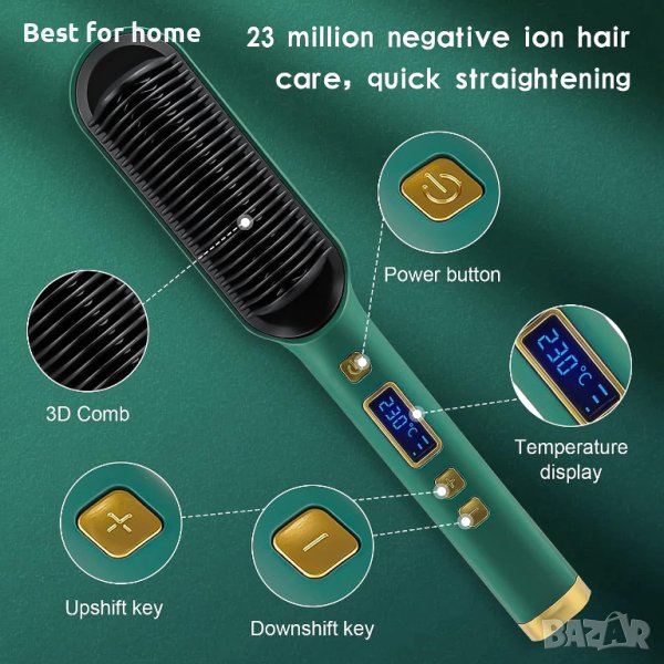 [360° въртящ се заден LED дисплей]- Интимен дизайн, 360° въртящо се въже; вдлъбнат бутон за избягване на случайно изключване; натиснете дълго бутона за захранване за около 2 секунди, за да включите; бързо щракнете върху бутона + или -, за да промените температурата, което е по-удобно за използване. Няма нужда да усещате температурата в дланта си, четката за изправяне има LED дисплей за температура.