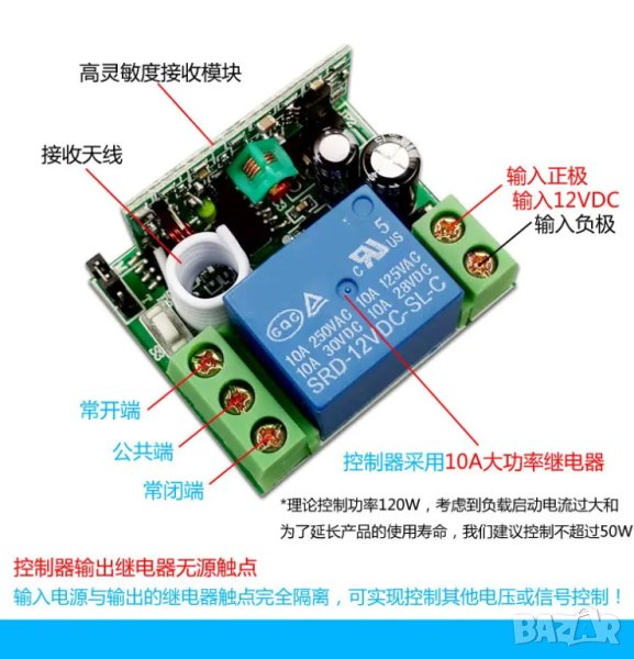 Ефективен и надежден модул за дистанционно управление на 12V устройства! С малки размери и лесно свързване, този модул е идеален за управление на осветление, автомобилни аксесоари и различни DC системи без необходимост от кабели.