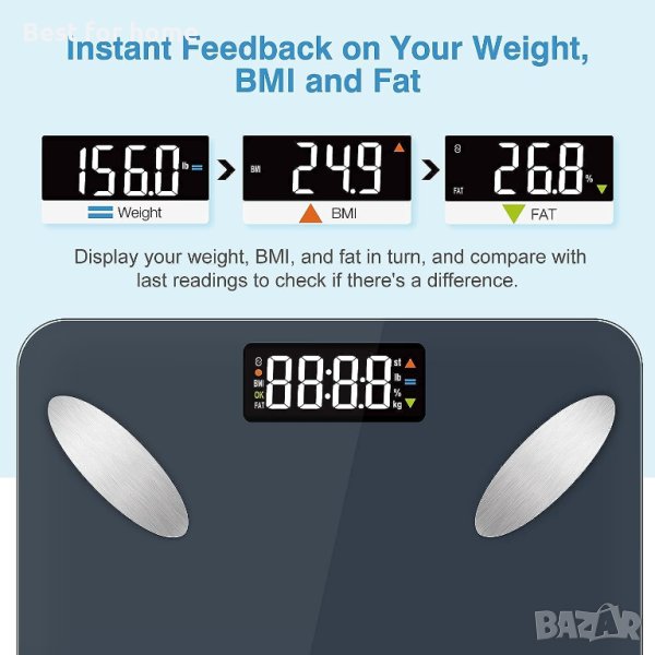 Технология Smart-Check: Везната може да открие разликата между новите измервания и последните измервания. Той може незабавно да покаже теглото, телесните мазнини и ИТМ на дисплея на везната и ще ви каже дали данните са нагоре или надолу чрез специалната икона.