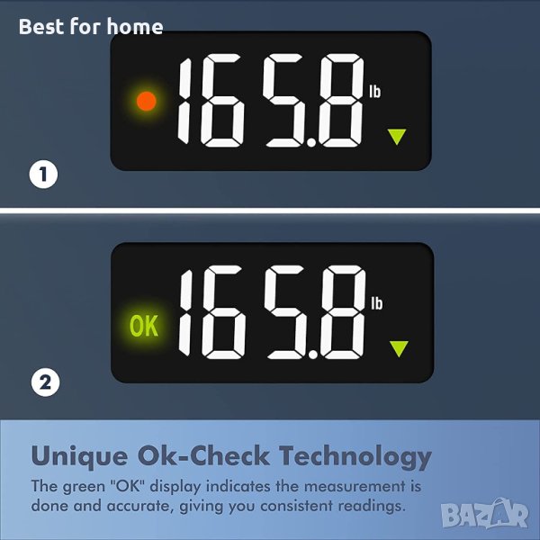 Технология OK-Check: Оранжевата икона ще мига три пъти, за да открие три пъти и провери данните по време на измерването, а след това оранжевата икона ще се промени на зелена икона „OK“, за да заключите и потвърдите вашето тегло, телесни мазнини, ИТМ и други данни. точност и последователност.