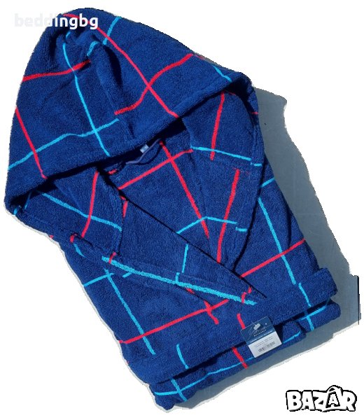 Удобен и мек, с перфектна попиваемост в червени и петролени квадрати върху тъмносин (индиго) фон.