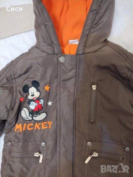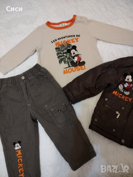 Комплект от 3 части Мики Маус размер 18 месеца. Якето и панталончето са ватирани. Във много добро състояние, само едно от декоративните ципчета е счупено вижда се на втората снимка.
