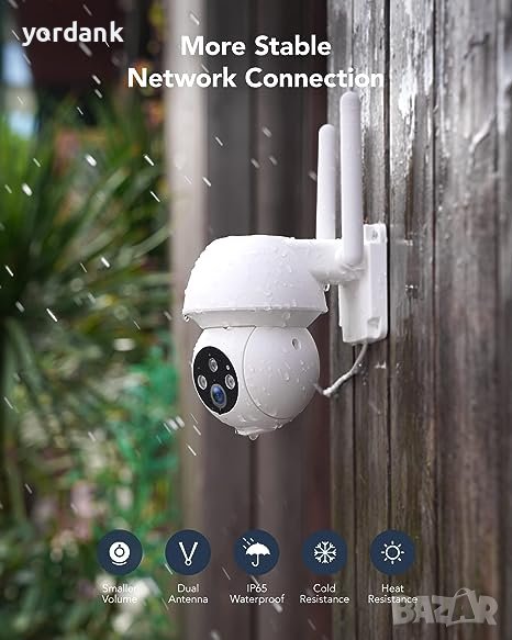 *[Стабилна WiFi връзка и IP65 водоустойчивост] - Двойните 4DBI антени дават на безжичната външна камера по-силно и по-стабилно мрежово приемане в сравнение с други камери. Водоустойчивият дизайн IP66 може напълно да предотврати навлизането на прах и пръски вода. Може да работи безупречно, независимо от излагане на дъжд или слънце.